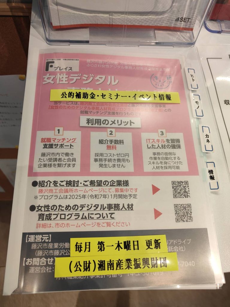 本日は今年度最後の湘南藤沢インキュベーションLaboにやって参りました。 湘南藤沢インキュベーションLaboには日中配送業者の方々や訪問者など静けさの中にも 活気を感じられます。そして環境的にも落ち着いた雰囲気があるこの施設は研究開発として うってつけの施設と感じております。 さて、IM室前に置いてある各種情報提供資料に新たらしくIT導入補助金と小規模事業者持続化補助金の最新の公募要領を追加いたしました。 以下のサイトからも詳細をご覧いただけます。 IT導入補助金 小規模事業者持続化補助金 https://it-shien.smrj.go.jp