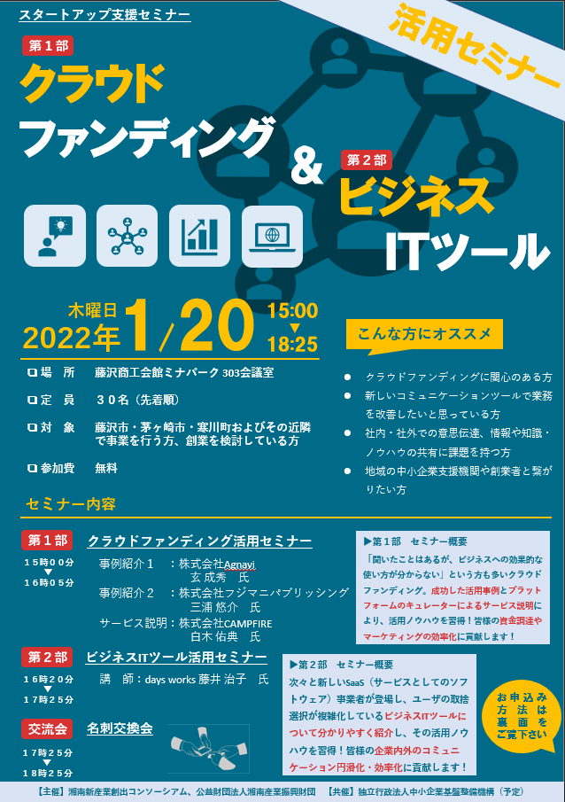 創業者や新規事業開発を行う中小企業の方向けに、スタートアップ支援セミナーと題し、クラウドファンディングの活用ノウハウとビジネスITツールの活用ノウハウを学ぶセミナーを2部制で開催いたします。セミナー後には名刺交換会もございます。