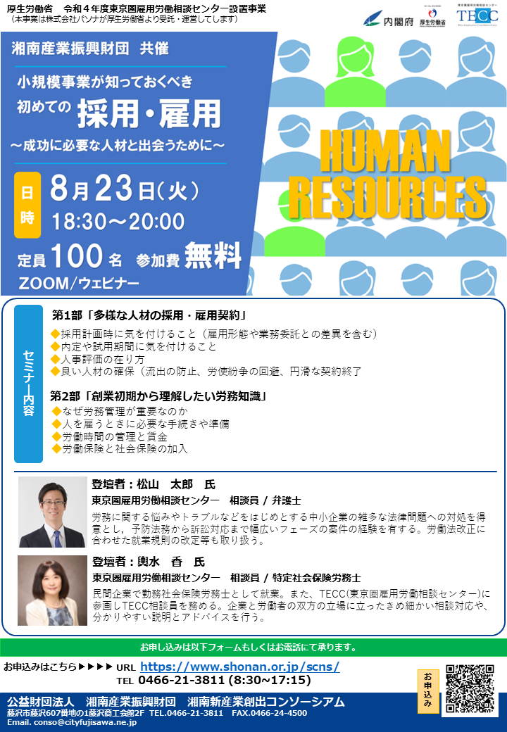 創業者やコンソーシアム会員の方向けに、初めての採用・雇用をテーマにしたセミナーを2部制で開催いたします。