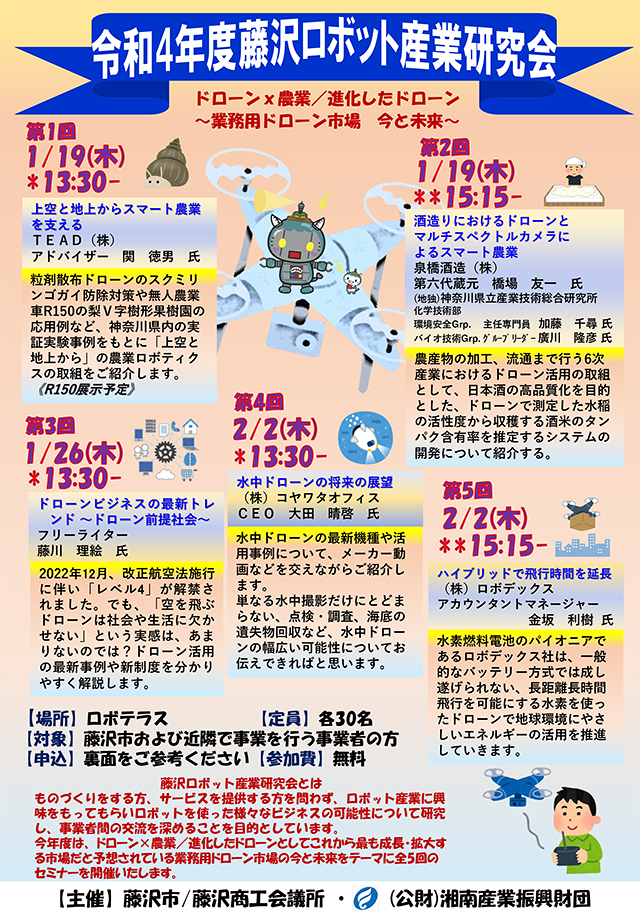 本研究会では、ものづくり、サービス業問わず、ロボット産業への興味・理解を深め、新たに挑戦・参入する企業の掘り起こしをするとともに、同業・異業種企業のマッチングによる新たな気づきや共同研究等を促し、ロボット事業を実ビジネスにつなげることを目的としています。今年度は、スマート農業技術に関するロボット等の多様な可能性とニーズをテーマにセミナーを開催いたします。