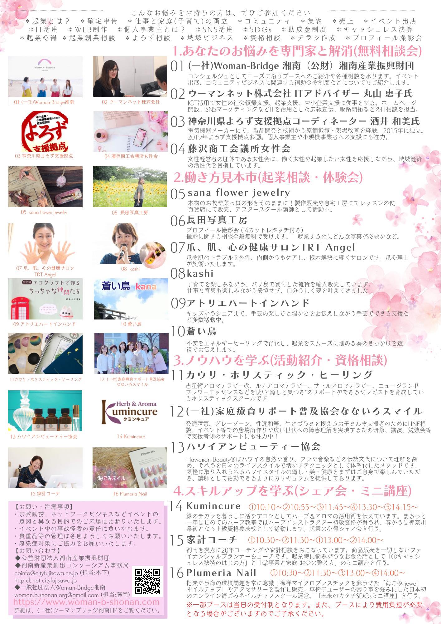※当日受付、有料のブースもございます。詳細は、ウーマンブリッジ湘南HP(www.woman-b-shonan.com/)をご覧ください。
