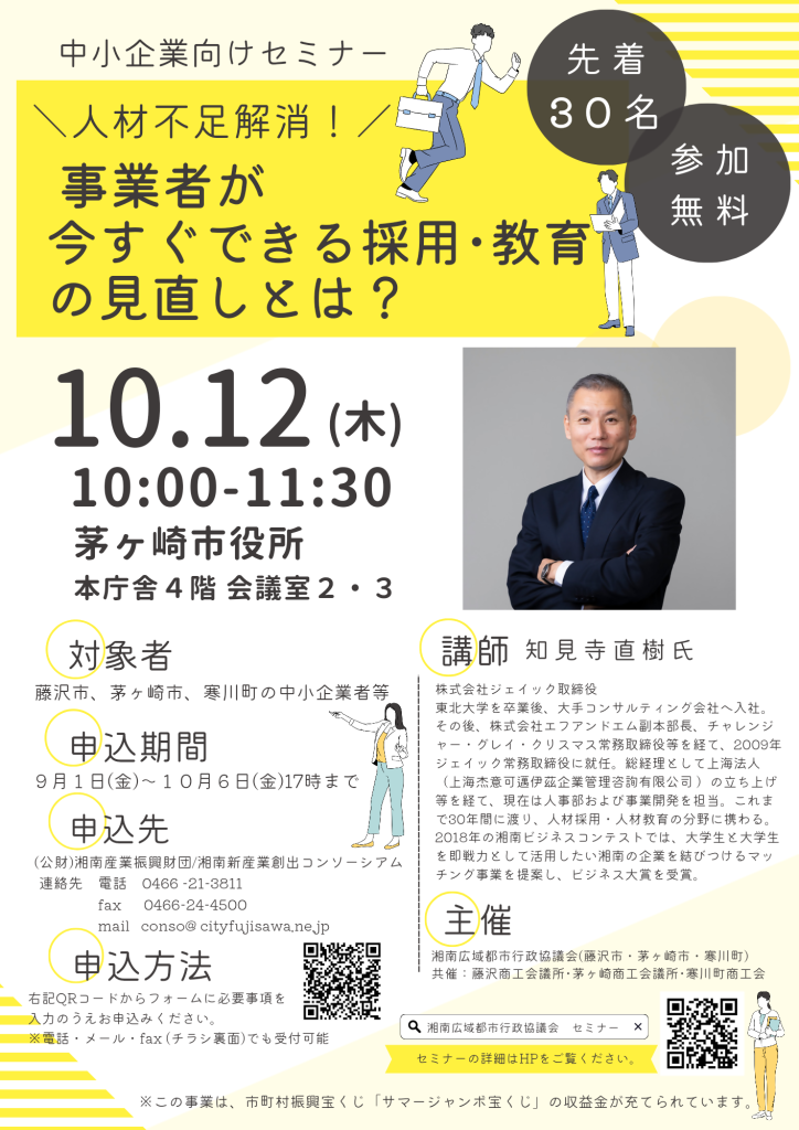 2市1町(藤沢市・茅ヶ崎市・寒川町)の共通課題である人手不足の解消に資するため、求人求職に関する情報の共有や、中小企業の人材確保・定着のノウハウ等の習得ができる【人材不足解消セミナー】を開催します。