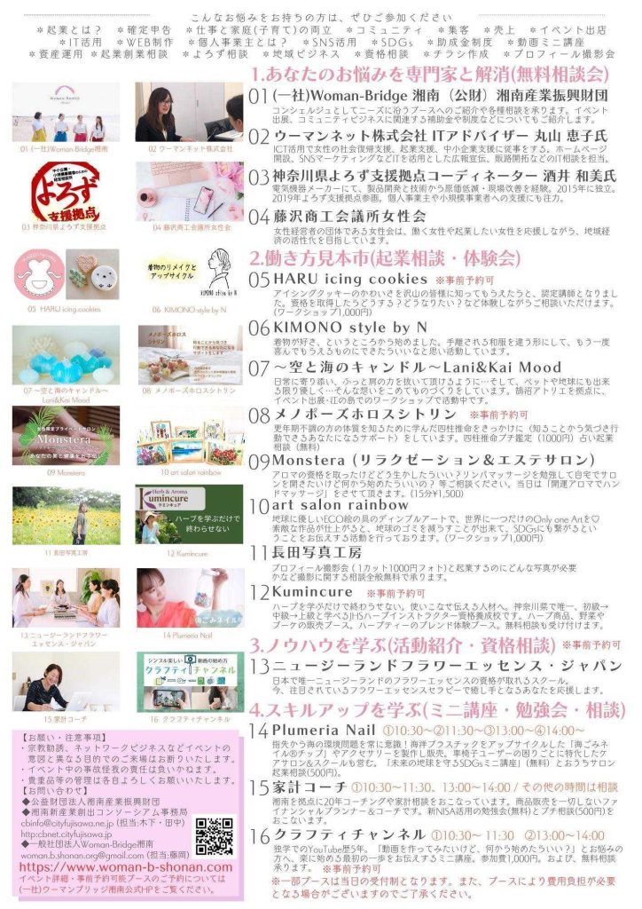 本イベントはコミュニティビジネスを支援する(公財)湘南産業振興財団と地域の女性やママを対象に起業支援を行っている一般社団法人Woman-Bridge湘南がタイアップし、「湘南藤沢でアクティブに活躍する女性を応援」をテーマに起業している女性をブース展示やピッチによりご紹介するとともに、これから起業を考えている女性のみなさんのネットワークや相談の場として開催します!