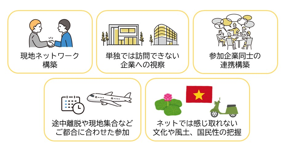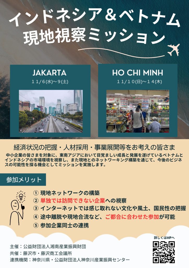 中小企業の皆様を対象に、東南アジアにおいて目覚ましい成長と発展を遂げているベトナム社会主義共和国(ホーチミン市・ハノイ市)とインドネシア共和国(ジャカルタ市)の市場環境を視察するとともに、現地企業や人材関連機関などとのネットワーキングを実施し、今後のビジネスの可能性を探る機会としてご活用いただけます。