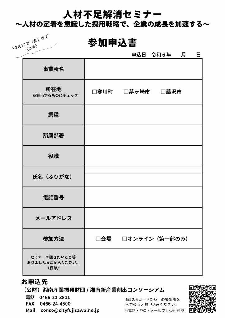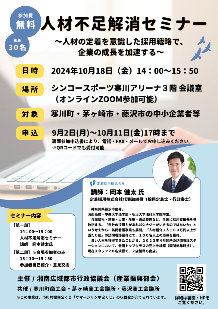 2市1町(藤沢市・茅ヶ崎市・寒川町)の共通課題である人手不足の解消に資するため、求人求職に関する情報の共有や、中小企業の人材確保・定着のノウハウ等の習得ができる【人材不足解消セミナー】を開催します。