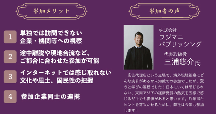 中小企業の皆様を対象に、東南アジアにおいて目覚ましい成長と発展を遂げているベトナム社会主義共和国(ホーチミン市・ダナン市)とインドネシア共和国(ジャカルタ市)の市場環境を視察するとともに、現地企業や人材関連機関などとのネットワーキングを実施し、今後のビジネスの可能性を探る機会としてご活用いただけます。