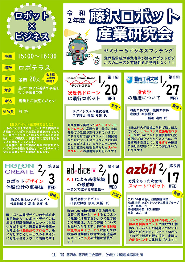 今年度は、様々な業務の効率化に貢献するロボットの多様な可能性とニーズをテーマに全5回のセミナー兼交流会を開催いたします。
