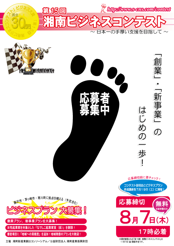 | 藤沢市・茅ヶ崎市・寒川町で事業の拠点を構える(予定含む)、 「創業」や「新事業」に特化したビジネスプランを大募集!! “日本一の手厚い支援”を目指す「第15回 湘南ビジネスコンテスト」<平成26年11月7日(金)>を開催いたします。 書類審査、プレゼンテーション(コンテスト)審査により選出された応募者には「事業・研究助成金」が授与されます。 その他にも・・・ ●ビジネス大賞30万円!事業評価の機会! ●プレゼンテーション審査は15分!事業をアピールするチャンス! ●最終審査会場には専門家や地域企業、金融機関などが多数参加!新たな出会いや交流を演出! ●終了後も継続したフォローアップを実現! 経営課題解決に向けて! など、今後の事業発展のお手伝いをさせていただきます。 事業を伸ばす“はじめの一歩”はこのコンテストから! まずは、「仮申請書」(エントリーシート)からご応募ください。 |
