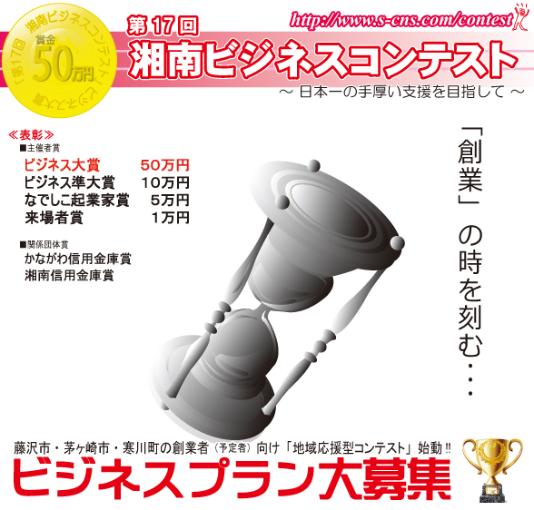 | 藤沢市・茅ヶ崎市・寒川町に拠点を置く(予定含む)、「創業」や「新事業」のビジネスプランを大募集! 独自の『成長支援システム』でビジネスプランのブラッシュアップを図るほか、審査員が応募者の事業を成長・成功に導くための方策を一緒に考える「地域応援型コンテスト」です。 専門家等による各種アドバイスと支援機関のネットワークで、ビジネスの確立に向けたお手伝いを行って参ります! 「湘南ビジネスコンテスト」は書類審査、プレゼンテーション審査(11月11日開催)により各受賞者を決定します! 事業の成長を早める本コンテストへ、是非ご応募ください。 |