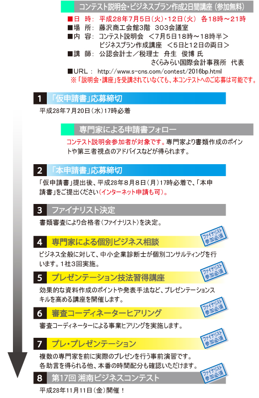 | ●本コンテストは、ご応募いただくことによりさまざまなブラッシュアップを図って参ります。 ●コンテスト応募前や期間中の各種ブラッシュアップ、終了後のフォローアップと、充実した支援体制でみなさまをお待ちしております。 ●「説明会・ビジネスプラン作成2日間講座」に受講されていなくても本コンテストへのご応募は可能です。 |
