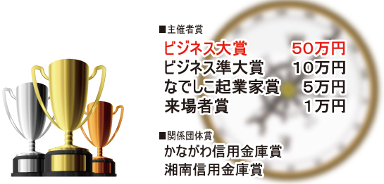 | ※主催者賞のうち、「ビジネス大賞」「ビジネス準大賞」「なでしこ起業家賞」は、審査員が選出いたします。 ※関係団体賞は、各金融機関が選出いたします。 ※主催者賞、関係団体賞それぞれ該当者無しの場合もあります。 ※ビジネス準大賞は複数本に分割する場合があります。 ※なでしこ起業家賞は他賞との重複もあります。 ※関係団体賞は他賞と重複することもあります。 ※関係団体賞の副賞は、各金融機関に一任しております。 |